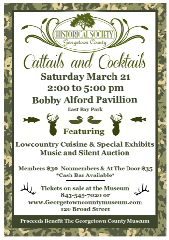 Once again, local hunters and fishermen will gather to prepare a feast at our annual event - Cattails & Cocktails, celebrating its 18th year. The Georgetown County Historical Society sponsors this event and will feature dishes of local catches ranging from Fin, Feathers and Fur.